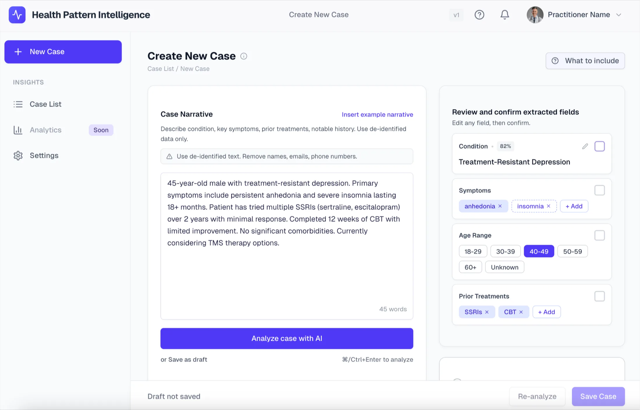 Collaborative IntelligenceThe core value proposition is the intelligence engine. We designed the interface to present AI-generated insights — extracted symptom patterns, similar case outcomes, top treatment recommendations — directly alongside traditional clinical notes in a side-by-side layout that builds trust rather than replacing judgment.