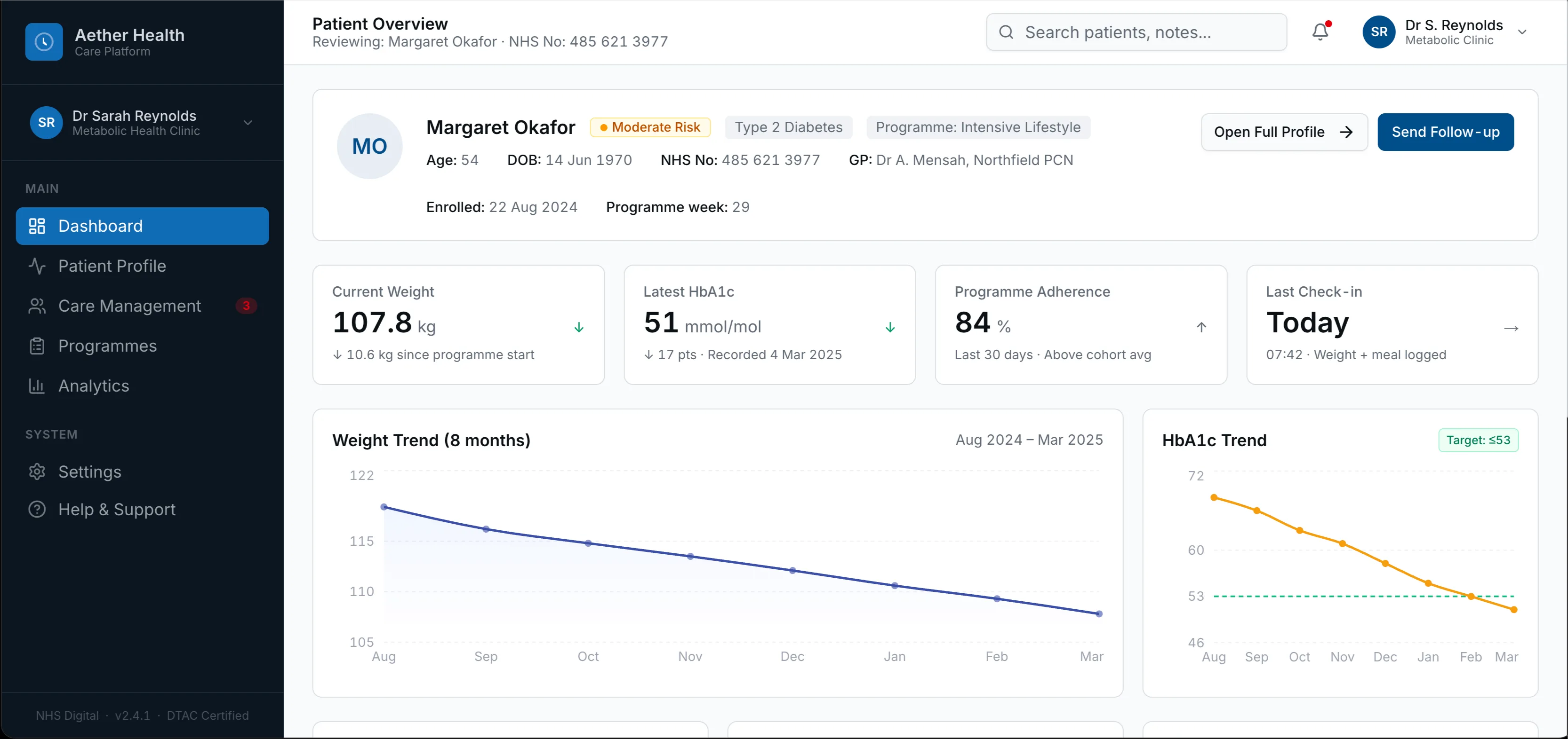 Clean, interactive data visualisations replace raw number dumps. Clinicians instantly view longitudinal trends for weight, HbA1c, blood pressure, and daily glucose alongside patient-reported symptoms — enabling rapid pattern recognition and precise adjustments.
